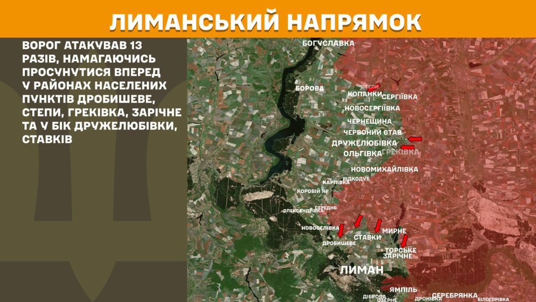 V Lyman Nepřítel zaútočil třináctkrát a pokusil se postoupit v oblastech Drobyševe, Stepy, Hrekovka, Zarichne a směrem na Druželiubivku a Stavky.