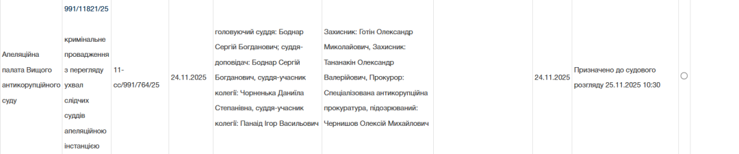 Jak bylo uvedeno, 24. listopadu podal Oleksij Černyšov odvolání k odvolacímu senátu Nejvyššího protikorupčního soudu, aby přezkoumal rozhodnutí NKÚ o volbě předběžného opatření ve věci nezákonného obohacení č. 991/11821/25. Odvolání bylo zamítnuto.