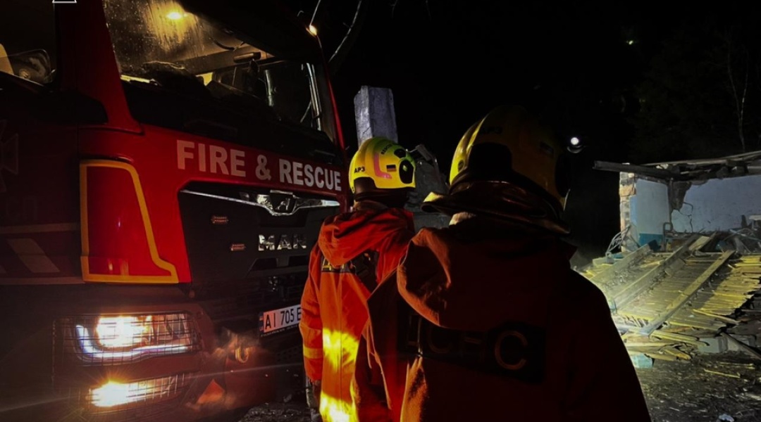 Ve Svjatošynském okrese byla u čtyřpatrové budovy skladu nalezena těla čtyř lidí a další tři lidé byli zraněni. Požár byl uhašen .