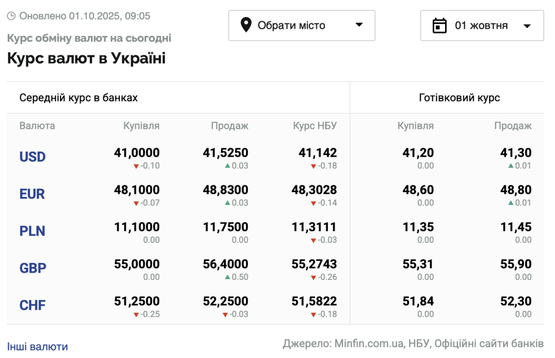 - 1 долар США - 41,14 грн (41,31 грн станом на 30 вересня);