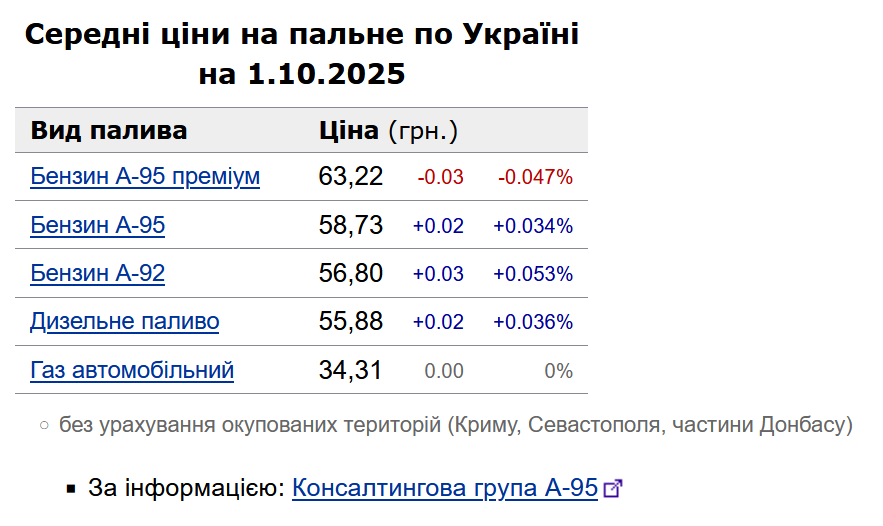 Як повідомлялося, у вівторок, 30 вересня, середня ціна на бензин марки А-95 знизилася на 2 коп. до 58,71 грн/л, на дизельне пальне - на 2 коп. до 55,86 грн/л.