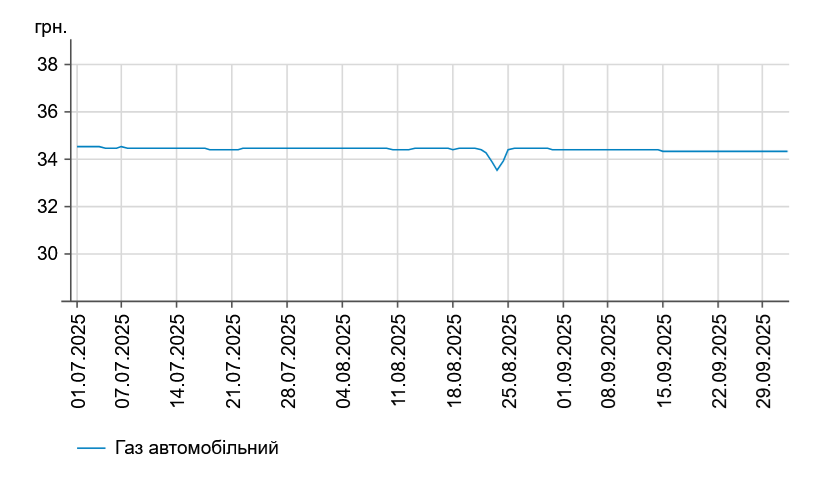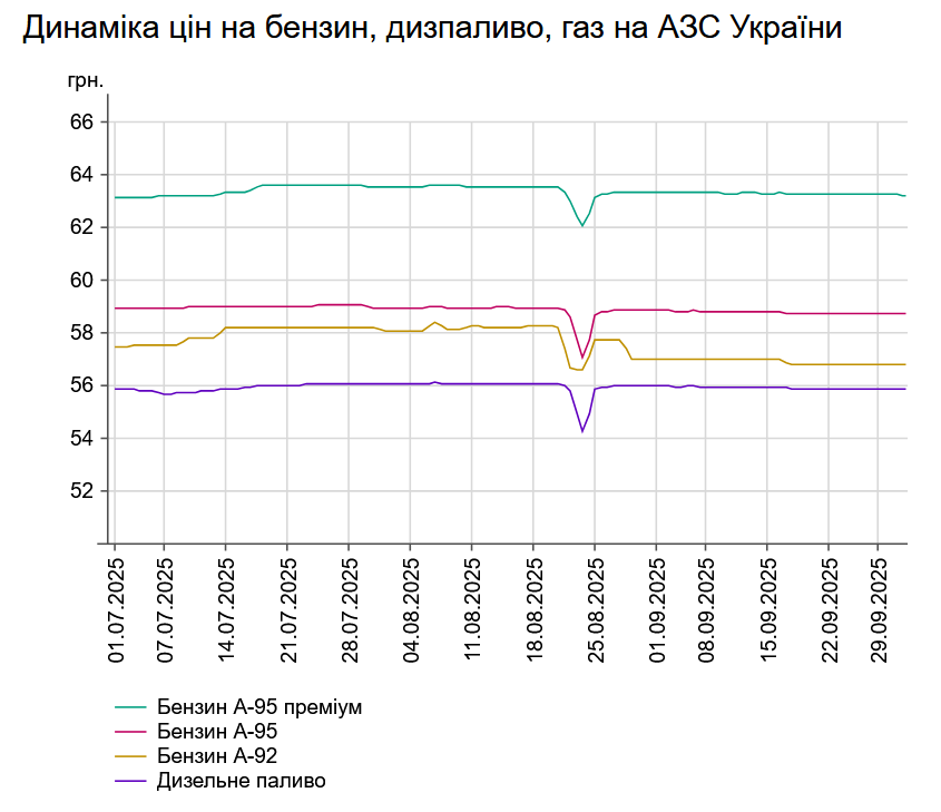 Зокрема, зафіксовано такі середні ціни на пальне: бензин марки А-95 (преміум) - 63,22 грн/л (здешевшав на 3 коп.); бензин марки А-95 - 58,73 грн/л (здорожчав на 2 коп.); бензин марки А-92 - 55,8 грн/л (здорожчав на 3 коп.); дизельне пальне - 55,88 грн/л (здорожчало на 2 коп.). Середня ціна автогазу становить 34,31 грн/л, що відповідає рівню попереднього дня.