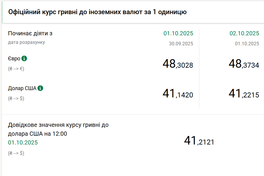 - 1 долар США - 41,22 грн (41,14 грн станом на 1 жовтня);