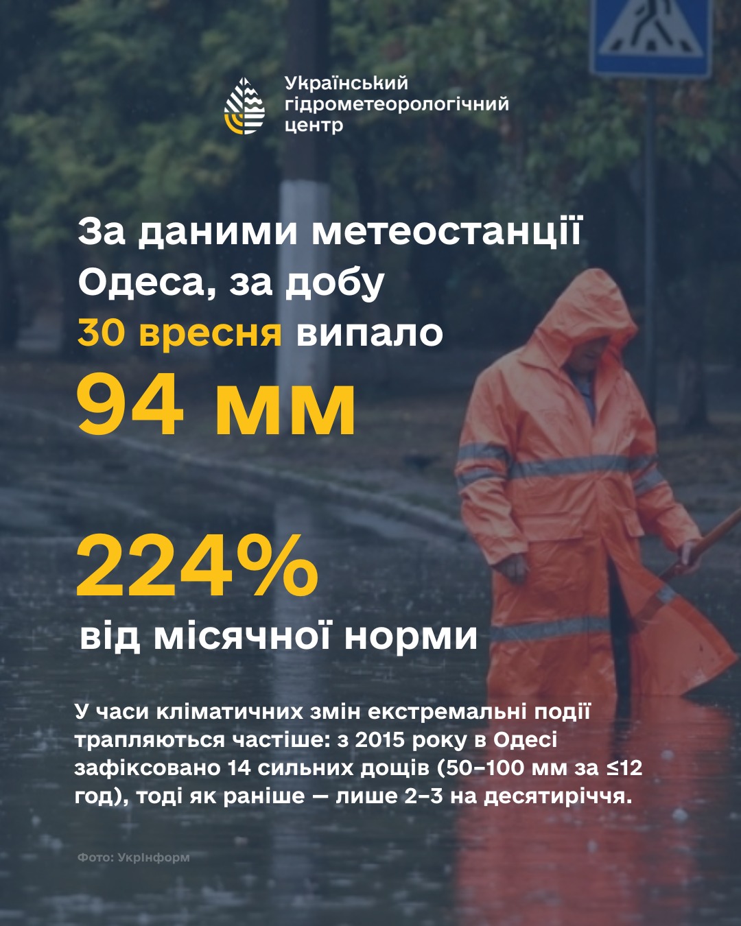 «За даними метеостанції Одеса, за добу випало 94 мм - це 224% від місячної норми. У 2016 році 20 вересня на метеостанції Одеса було зафіксовано добовий рекорд опадів, 113 мм», - ідеться в повідомленні.