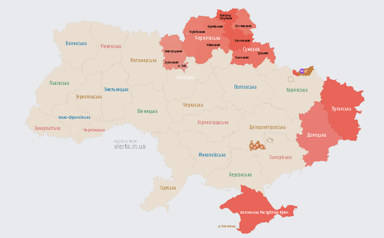На карті повітряних тривог о 23:50 повідомляється про небезпеку в кількох областях.