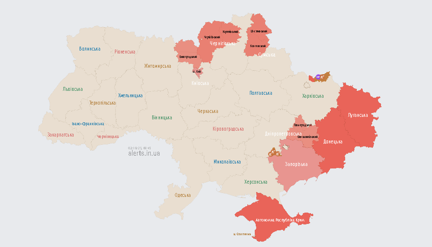 На карті повітряних тривог о 06:41 повідомляється про небезпеку в кількох областях.