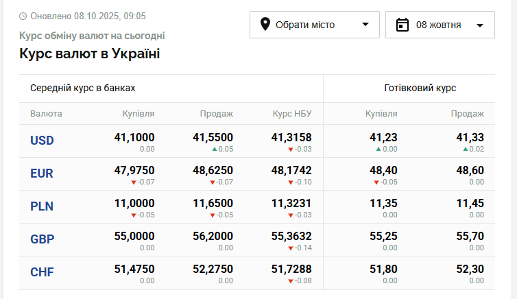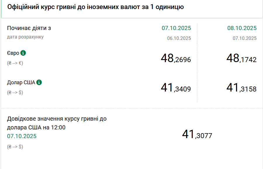 - 1 долар США - 41,31 грн (41,34 грн станом на 7 жовтня);