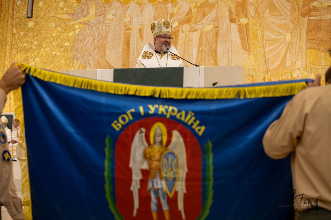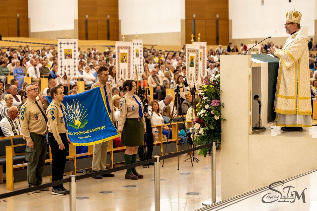 Паломники миру тримали стяг у руках під час Архиєрейської літургії. Богослужіння очолив глава Української греко-католицької церкви Блаженніший Святослав, який у своєму слові згадав про СУМівців та їхній ювілей.