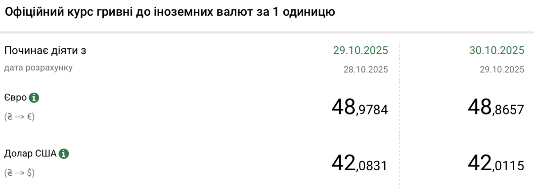 - 1 долар США - 42,01 грн (42,08 грн станом на 29 жовтня);