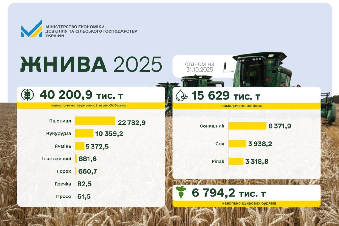 "Станом на 31 жовтня в Україні вже зібрано 40 200,9 тис. тонн зернових культур на площі 8770,8 тис. га. Обмолочено 76% площ, засіяних цими культурами", - ідеться в повідомленні.