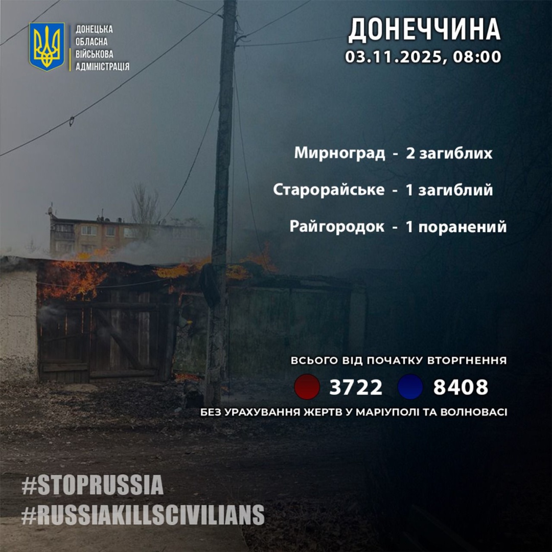 За його словами, 2 листопада росіяни вбили двох людей у Мирнограді та одну людину у Старорайському. Ще одна людина в області за добу дістала поранення.