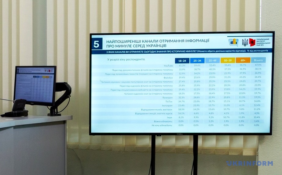 "Ми запитали про те, звідки українці отримують сьогодні знання про історичне минуле, щоб з'ясувати, власне, яким чином поширювати цю інформацію. І тут ми бачимо, що найпопулярніший канал - це відео в тому чи іншому форматі... Ютуб є дійсно найпопулярнішим каналом отримання даних про історію ", - сказав соціолог, засновник ТОВ "Оперативна соціологія" Денис Денисенко.