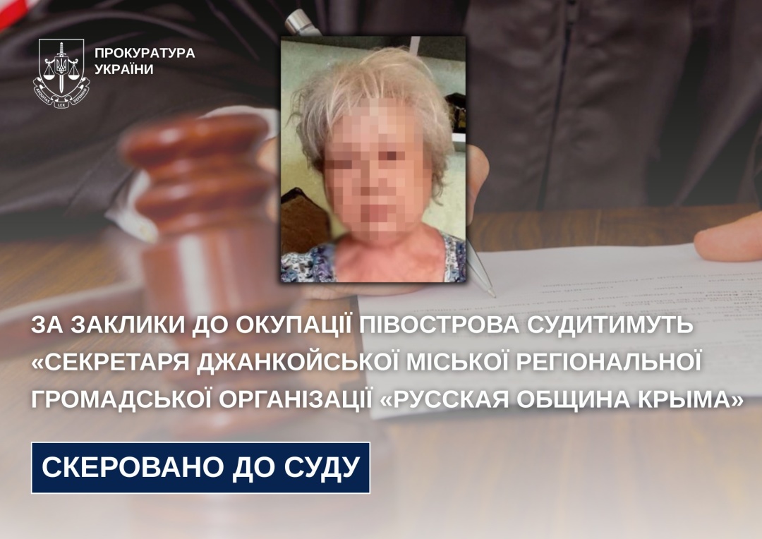 "Прокуратура автономії скерувала до суду обвинувальний акт стосовно «секретаря Джанкойської міської регіональної ГО «Русская община Крыма». Її дії кваліфіковано як державна зрада (ч. 1 ст. 111 КК України) та публічні заклики до вчинення дій з метою зміни меж території та державного кордону України (ч. 1 ст. 110 КК України)", - йдеться у повідомленні.