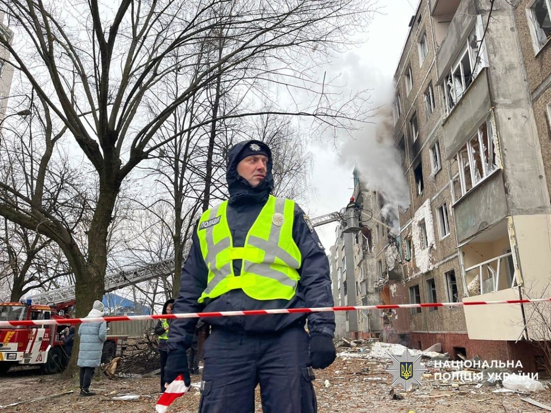 Поліцейські документують наслідки атаки росіян, проводять поквартирні обходи навколишніх житлових будинків, надають допомогу постраждалим громадянам.