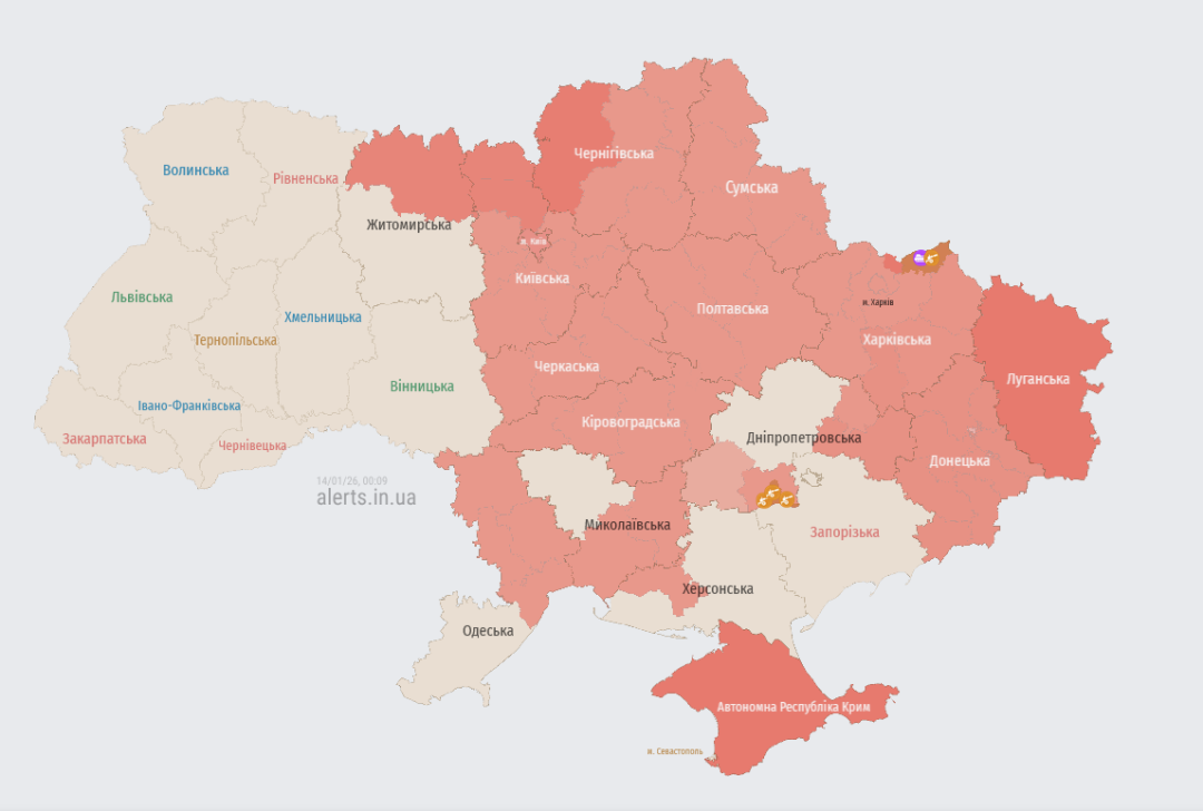 Актуальна мапа повітряних тривог станом на 00:09. Джерело: https://alerts.in.ua/