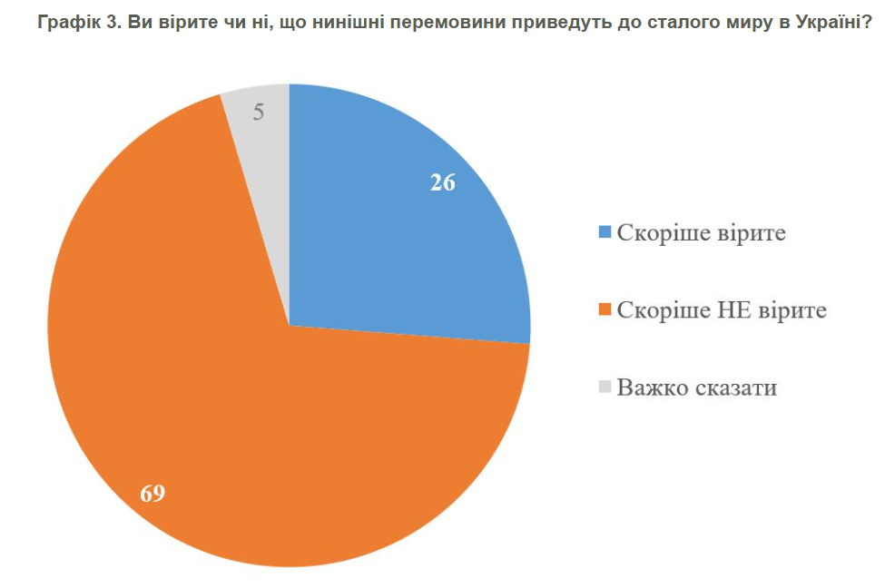 Опитування показало, що 69% не вірять, що нинішні перемовини приведуть до сталого миру і здебільшого українці пояснювали це небажанням самої Росії йти на мир та її бажанням продовжувати війну проти України. Лише 26% вірять у те, що переговори приведуть до сталого миру. Ще 5% не змогли визначитися із своєю думкою.