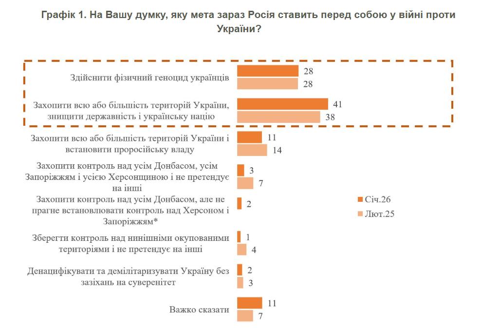 Переважна більшість українців – 69% – продовжують сприймати війну як екзистенційну загрозу і вважають, що Росія або хоче здійснити фізичний геноцид, або знищити українську націю і державність, у лютому 2025 року було майже стільки ж – 66%.