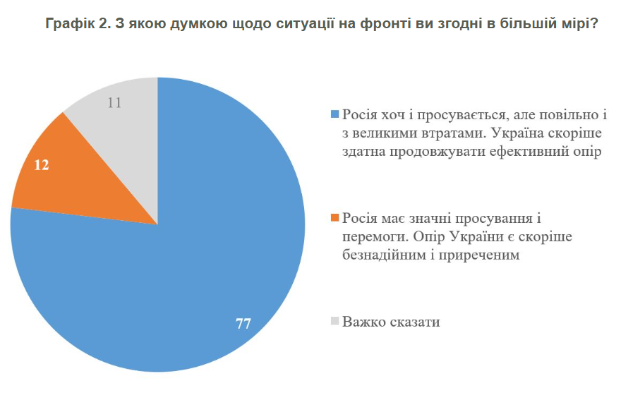 Дослідження показало, що поділяють більш песимістичний погляд, згідно з яким Росія має значні просування і перемоги, а опір України безнадійний – 12%. Ще 11% не змогли визначитися із своєю думкою.