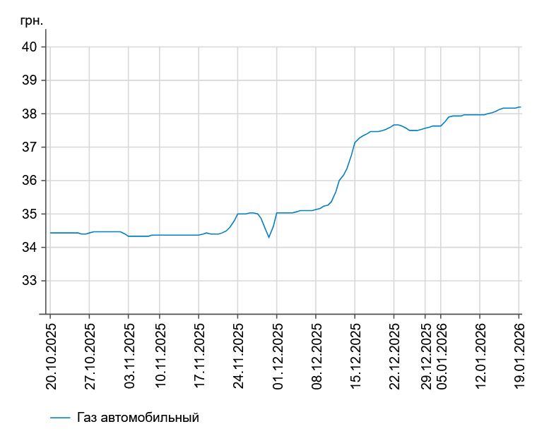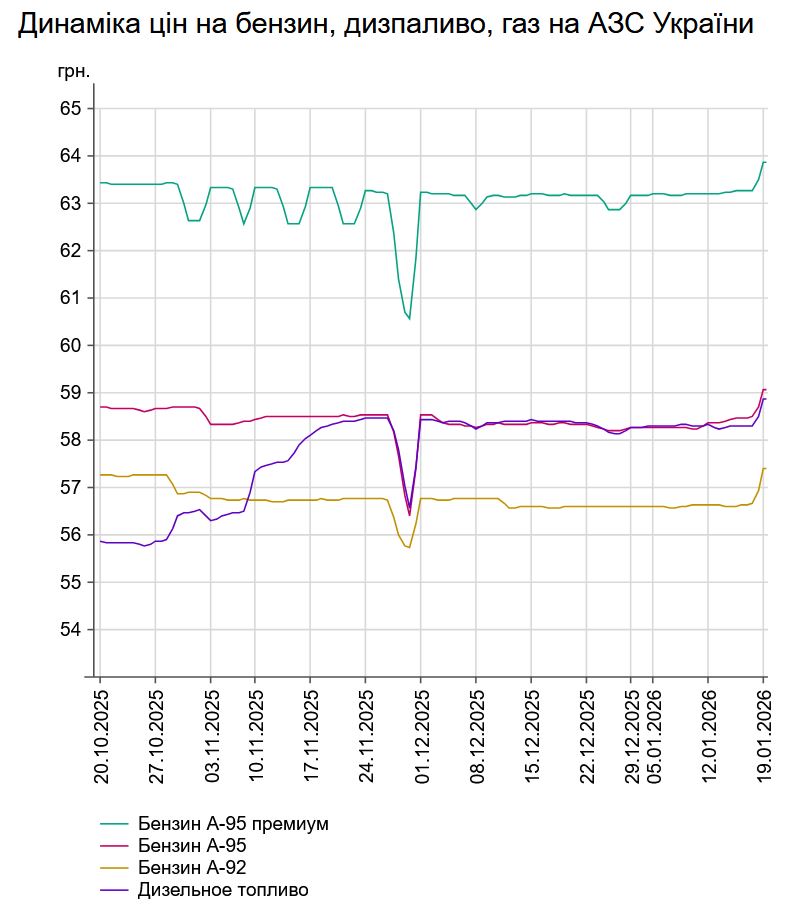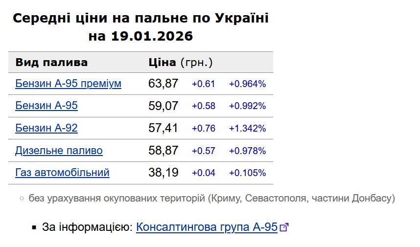 Зокрема, зафіксовано такі середні ціни на пальне: бензин марки А-95 (преміум) - 63,87 грн/л (здорожчав на 61 коп.); бензин марки А-95 - 59,07 грн/л (здорожчав на 58 коп.); бензин марки А-92 - 57,41 грн/л (здорожчав на 76 коп.); дизельне пальне - 58,87 грн/л (здорожчало на 57 коп.). Середня ціна автогазу становить 38,19 грн/л, що на 4 коп. дорожче порівняно із попереднім робочим днем - 16 січня.
