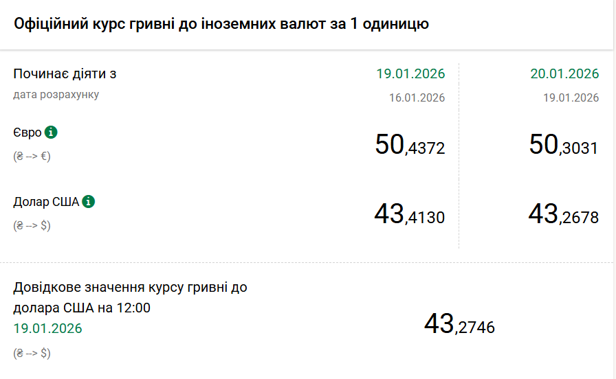 - 1 долар США – 43,26 грн (43,41 грн станом на 19 січня);