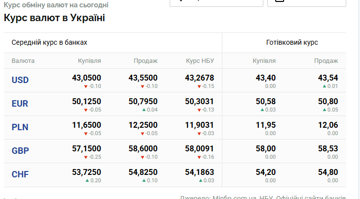 - долар США: 43,05 - 43,55 грн;