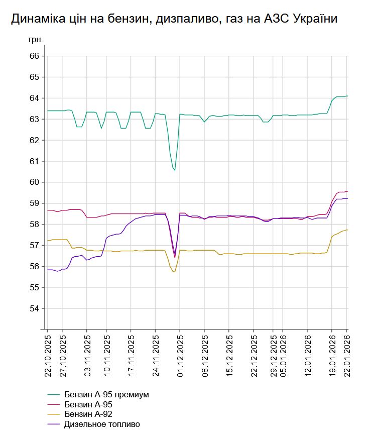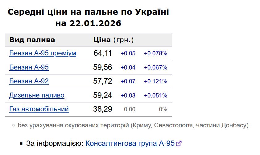 Як повідомлялось, у середу, 21 січня, середня ціна на бензин марки А-95 зросла на 5 коп. до 59,52 грн/л, на дизельне пальне - на 2 коп. до 59,21 грн/л.