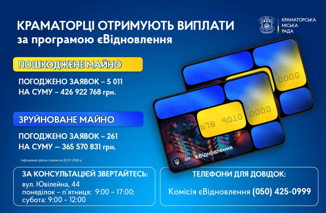 Зазначається, що мешканці Краматорська, чиє житло було пошкоджене, продовжують подавати відповідні заяви. Прийнято позитивних рішень по 5 011 заявам на загальну суму — 426 922 768 грн.