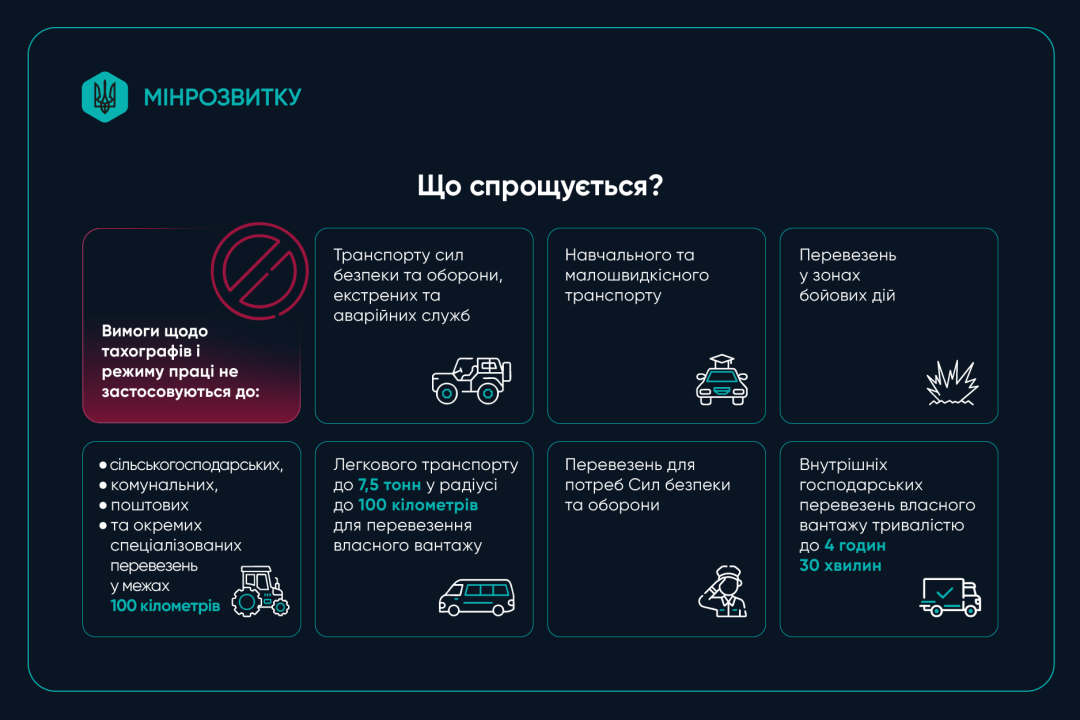 Водночас вимоги щодо використання тахографів та дотримання правил відпочинку та праці не застосовуватимуться до транспорту сил безпеки та оборони, екстрених та аварійних служб, сільськогосподарських, комунальних, поштових та окремих спеціалізованих перевезень у межах 100 км від їх місця зберігання транспортних засобів, легкового транспорту до 7,5 т у радіусі до 100 км від їх місця зберігання для перевезення власного вантажу за умови, що керування не є основною діяльністю підприємства.