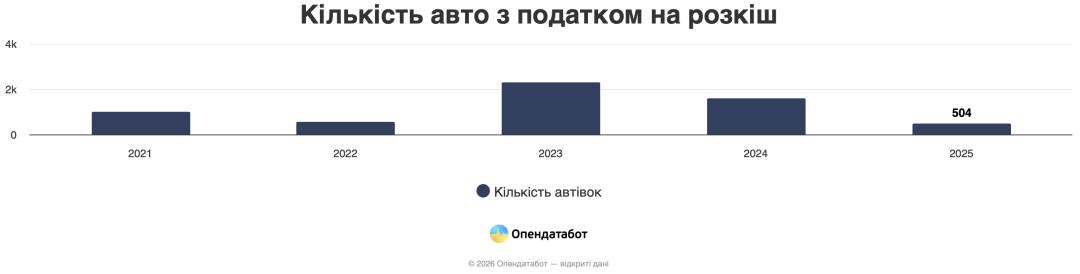 «504 авто, які підпадають під «податок на розкіш», було ввезено в Україну у 2025 році. Це у 3,2 раза менше, ніж у 2024 році. Загалом це найнижчий показник за останні 5 років», - йдеться у повідомленні.