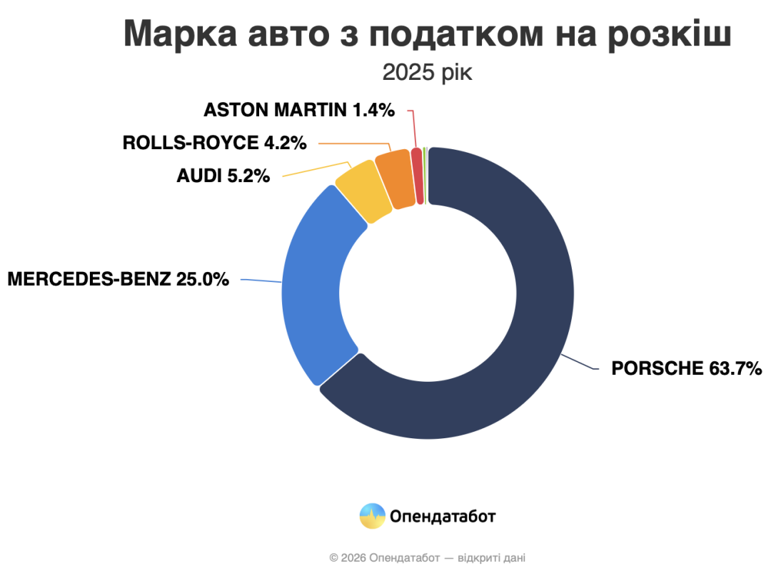 Кожен другий автомобіль у списку «розкішних» — Porsche Taycan (232 авто). Загалом Porsche стали лідером luxury-сегменту із додатковим оподаткуванням: на авто цієї марки припадає 64% загального обсягу.