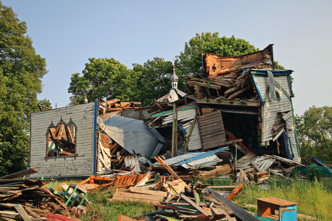 Наприклад, світлина руїн знищеної російським обстрілом 7 березня 2022 року дерев’яної Покровської церкви у В’язівці Житомирської області та фото "Магазину" — історичної будівлі на майдані Конституції у Харкові , пошкодженої внаслідок російського ракетного удару 2 березня 2022 року.