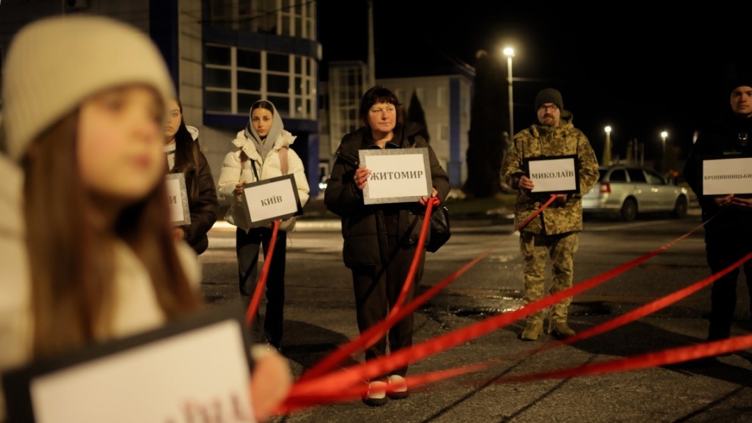Люди вишикувалися в єдиний живий ланцюг, тримаючи в руках картки з назвами всіх обласних центрів України та Автономної Республіки Крим.