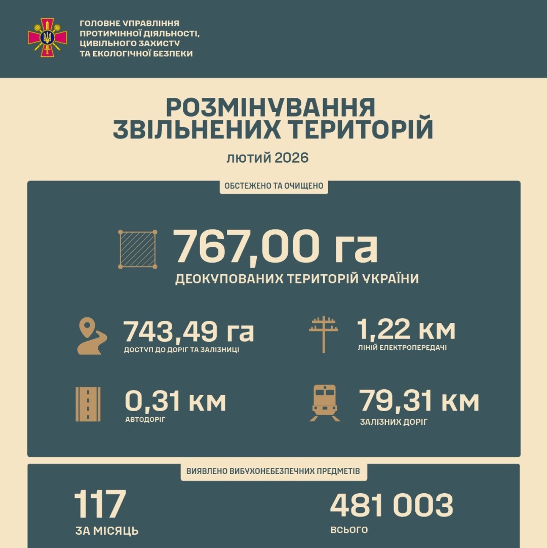 «За лютий 2026 року підрозділи розмінування Міністерства оборони України очистили 767 га звільнених територій, забруднених вибухонебезпечними залишками війни внаслідок збройної агресії РФ », - йдеться в повідомленні.