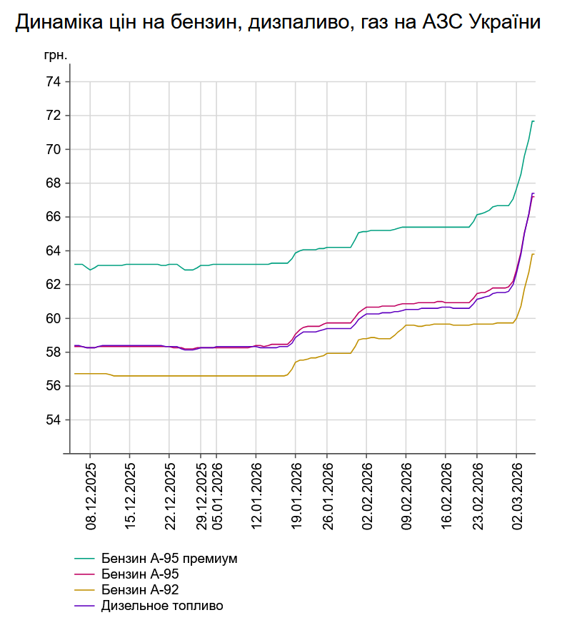Як повідомлялось, у вівторок, 3 березня, середня ціна на бензин марки А-95 зросла на 2 грн 20 коп. до 65,07 грн/л, на дизельне пальне - на 2 грн 33 коп. до 65,02 грн/л.