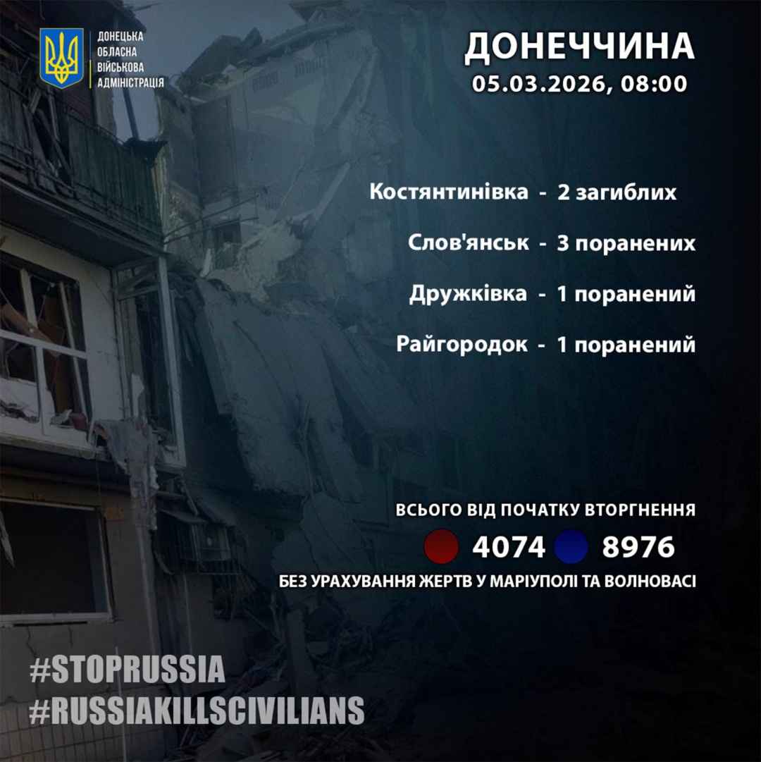 За його словами, росіяни вбили двох людей у Костянтинівці. Ще п'ятеро людей в області за добу дістали поранення.